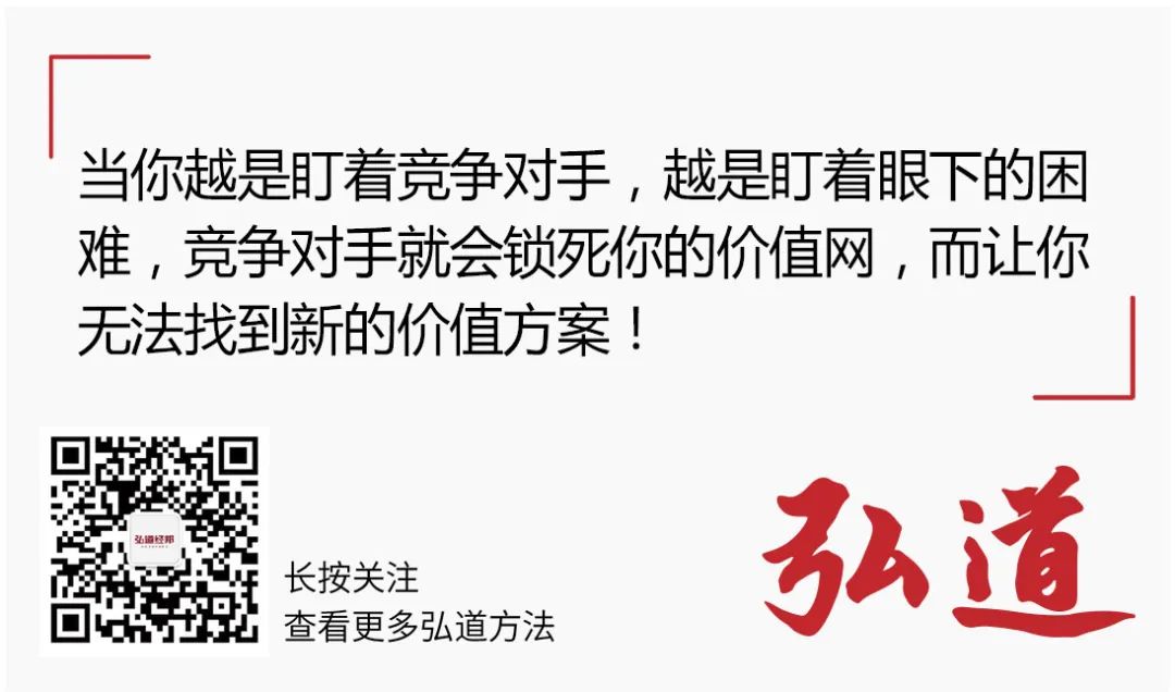 因?yàn)闆]法“爭(zhēng)”。弘道方法中有一句話:當(dāng)你越是盯著競(jìng)爭(zhēng)對(duì)手,越是盯著眼下的困難,競(jìng)爭(zhēng)對(duì)手就會(huì)鎖死你的價(jià)值網(wǎng),而讓你無法找到新的價(jià)值方案!