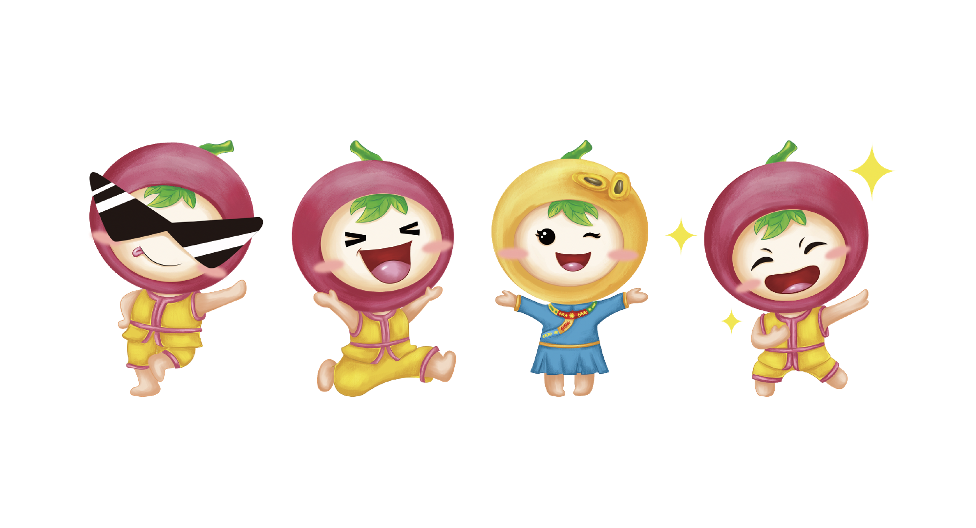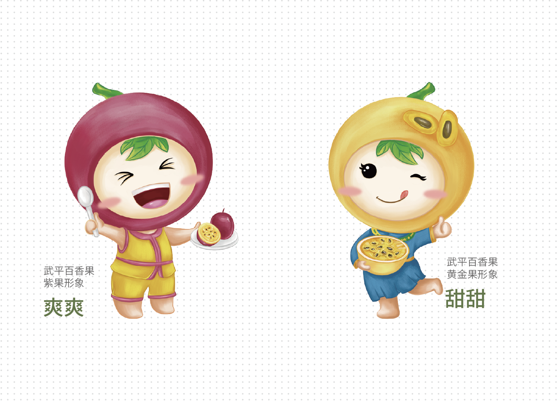除此之外,弘道公司為了便于后期品牌價(jià)值和故事的演繹及其傳播,為武平百香果創(chuàng)造了輔助傳播的“代言物”形象,在代言物中我們充分植入了武平縣當(dāng)?shù)乜图椅幕?,把客家人的服裝元素進(jìn)行了生動(dòng)融合,在一些特殊需要輔助形象的場(chǎng)景中進(jìn)行補(bǔ)充運(yùn)用。