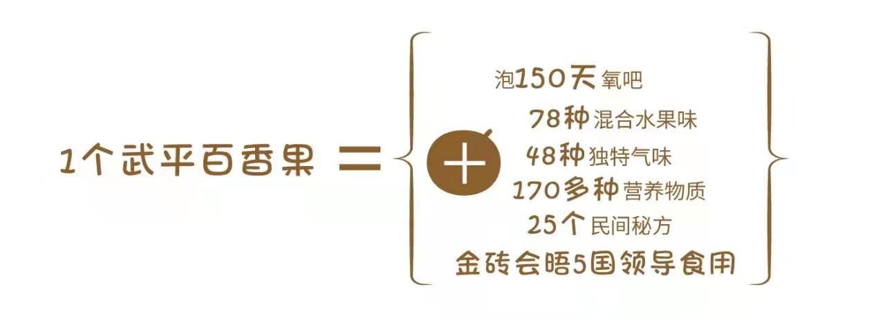 1個(gè)武平百香果=泡150多天氧吧+78種混合水果味+170多種營(yíng)養(yǎng)物質(zhì)+48種獨(dú)特氣味+25個(gè)民間秘方+金磚會(huì)晤5國(guó)領(lǐng)導(dǎo)宴請(qǐng)食用。