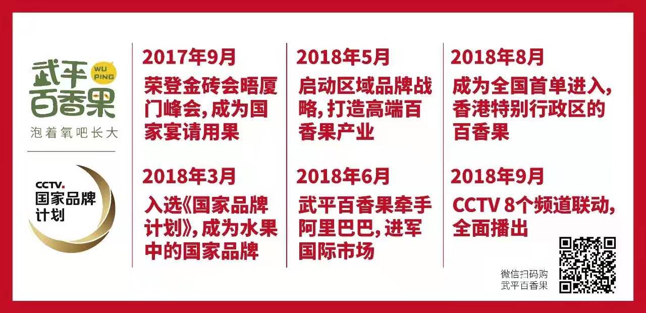 2018年9月,武平百香果品牌成功入選CCTV《國(guó)家品牌計(jì)劃》,央視免費(fèi)親拍親制廣告,在CCTV1套、CCTV2套、CCTV3套、CCTV4套、CCTV7套、CCTV8套、CCTV9套、CCTV13套共8個(gè)頻道展播,每天播出頻次不低于20次。這是國(guó)內(nèi)農(nóng)業(yè)區(qū)域公用品牌中,難得的榮耀,武平百香果迅速躋身成為百香果領(lǐng)域的國(guó)家隊(duì)!