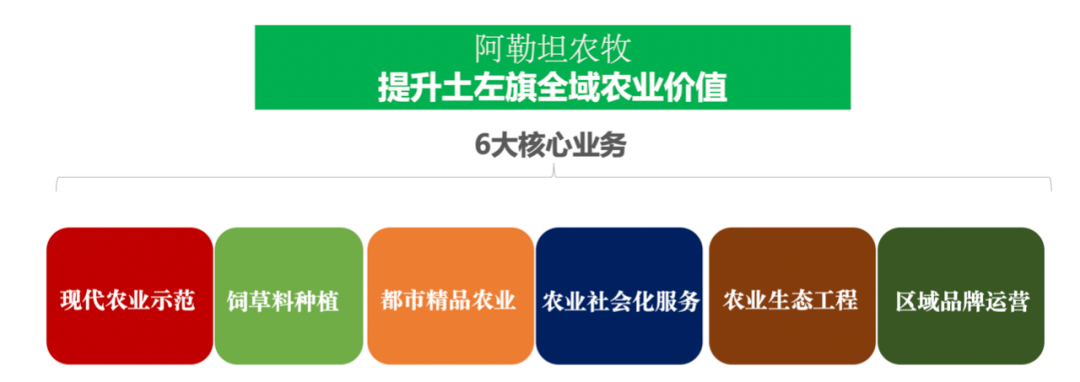 在完成阿勒坦品牌塑造的基礎(chǔ)上,考慮到阿勒坦公司旗下業(yè)務(wù)的復(fù)雜性,我們從未來的集團(tuán)化企業(yè)的視角,依托阿勒坦國企背景的資源優(yōu)勢及其草業(yè)業(yè)務(wù)的優(yōu)勢性,共用非界面配稱資源,圍繞土左旗“全域農(nóng)業(yè)價(jià)值提升的產(chǎn)業(yè)化集團(tuán)”的企業(yè)定位,梳理規(guī)劃了“飼草料種植”、“現(xiàn)代農(nóng)業(yè)示范”、“都市精品農(nóng)業(yè)”、“社會化服務(wù)”、“農(nóng)業(yè)生態(tài)工程”、“區(qū)域品牌運(yùn)營”等6大業(yè)務(wù)模塊,打造集團(tuán)化業(yè)務(wù)矩陣,此處不做詳解。